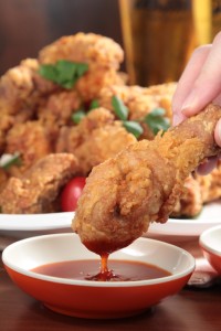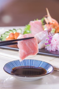 用筷子夾起吞拿魚腩壽司蘸醬油